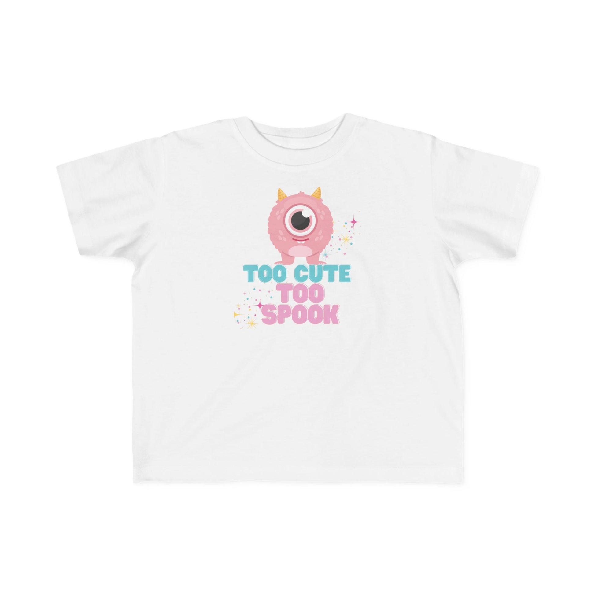 Adorable toddler girls too cute to spook monster t-shirt perfect for Halloween or everyday wear. The cute and funny design adds a playful touch to your little one's wardrobe, giving off a fun and whimsical vibe. Ideal for parents looking to dress up their toddler for Halloween or simply add a cute and stylish piece to their everyday outfits.